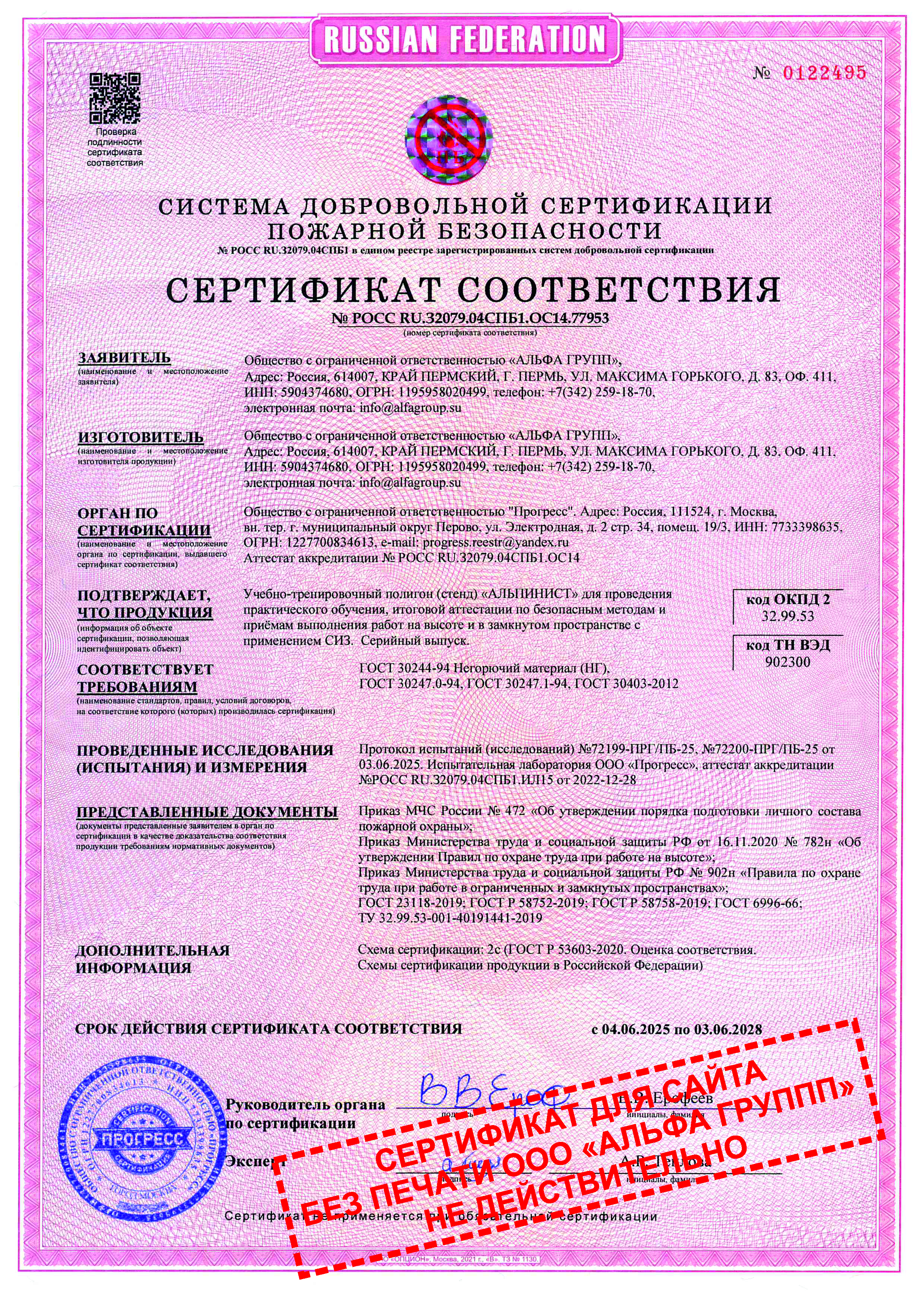 • Учебные комплексы «АЛЬПИНИСТ» сертифицированы и изготавливаются по Техническим условиям ООО «АЛЬФА ГРУПП» Полигон учебно-тренировочный ТУ 32.99.53-001-40191441-2019